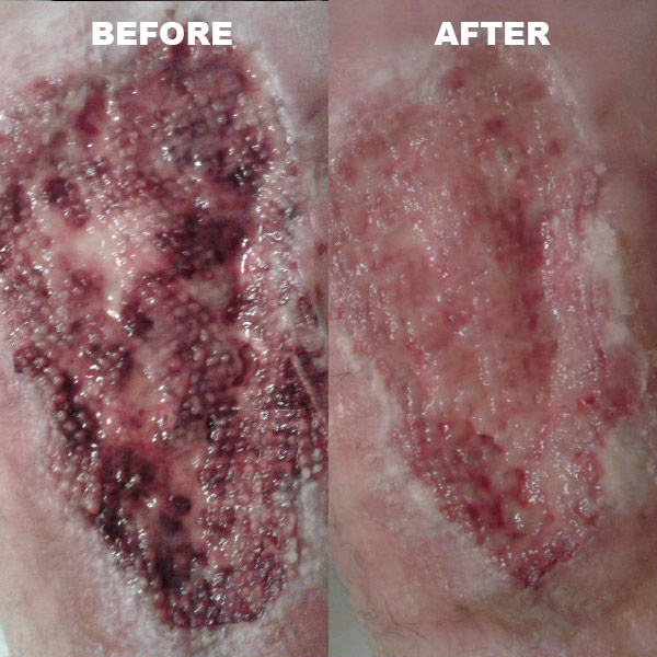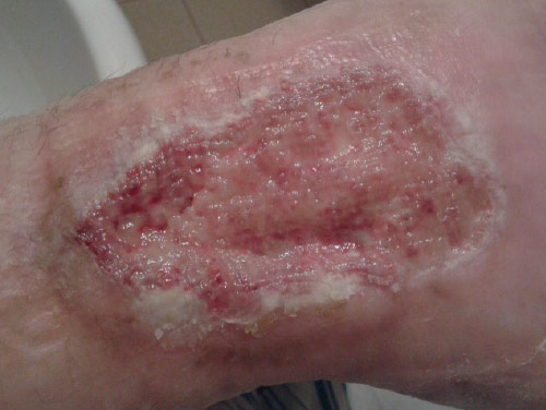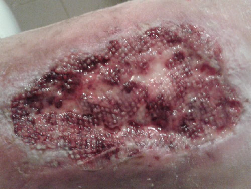 42 years old woman suffering from a post-partum DVT, coagulation deficiency and omozygote MTHFR mutation. Due to a light trauma she has developed a medial left malleolus chronic wound, necrotic and very painful.