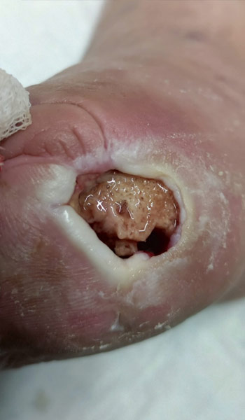 Neuropatic ulceration of right foot, with osteomyelitis and fistulation, positive probe-to bone test (8th march 2023)